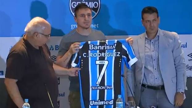 O meia Cristian Rodríguez foi apresentado oficialmente como novo jogador do Grêmio, na manhã desta quarta-feira, na arena do time tricolor. Ele recebeu a camisa 7 das mãos do presidente Romildo Bolzan Jr. e revelou estar ansioso para jogar logo - afinal, tem um contrato de empréstimo que se encerra em julho.
